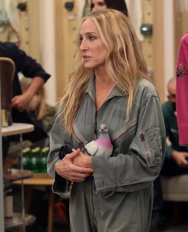 And that pigeon purse by JW Anderson? Carrie has the avain accessory tucked under her arm when she goes with Charlotte to the fictional Real Deal, a second-hand store where her daughter Lily sold some of her designer clothes. Charlotte is on the search for a pink Chanel dress that she is SHOCKED Lily had the nerve to sell. But who cares about the dress when Carrie is carrying a clutch shaped like a pigeon?!