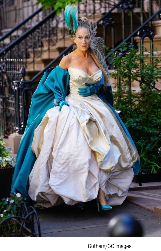 I’m sure you saw the leaked pictures of Carrie in that beautiful, repurposed Vivienne Westwood wedding dress. That fateful dress that went into the back of the closet like her feelings did after Big stood her up.