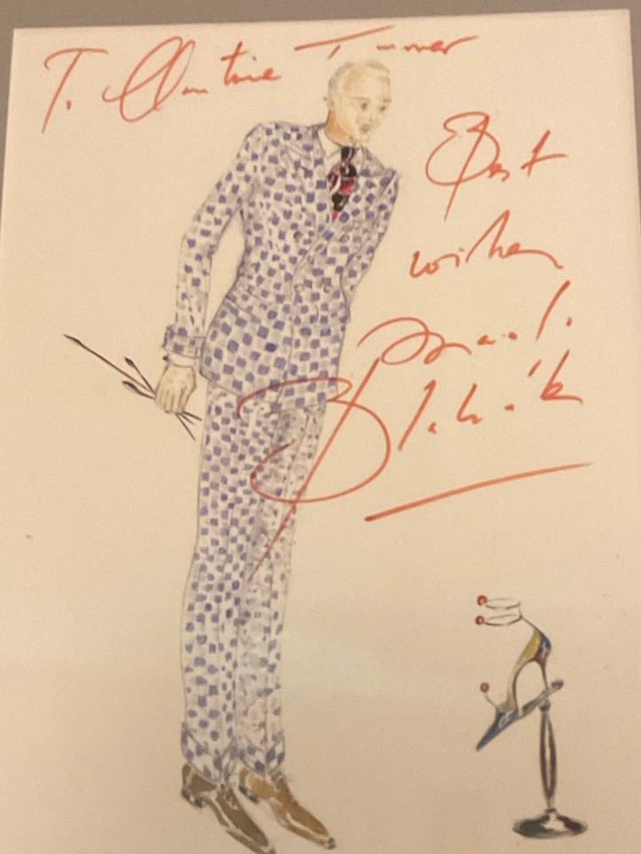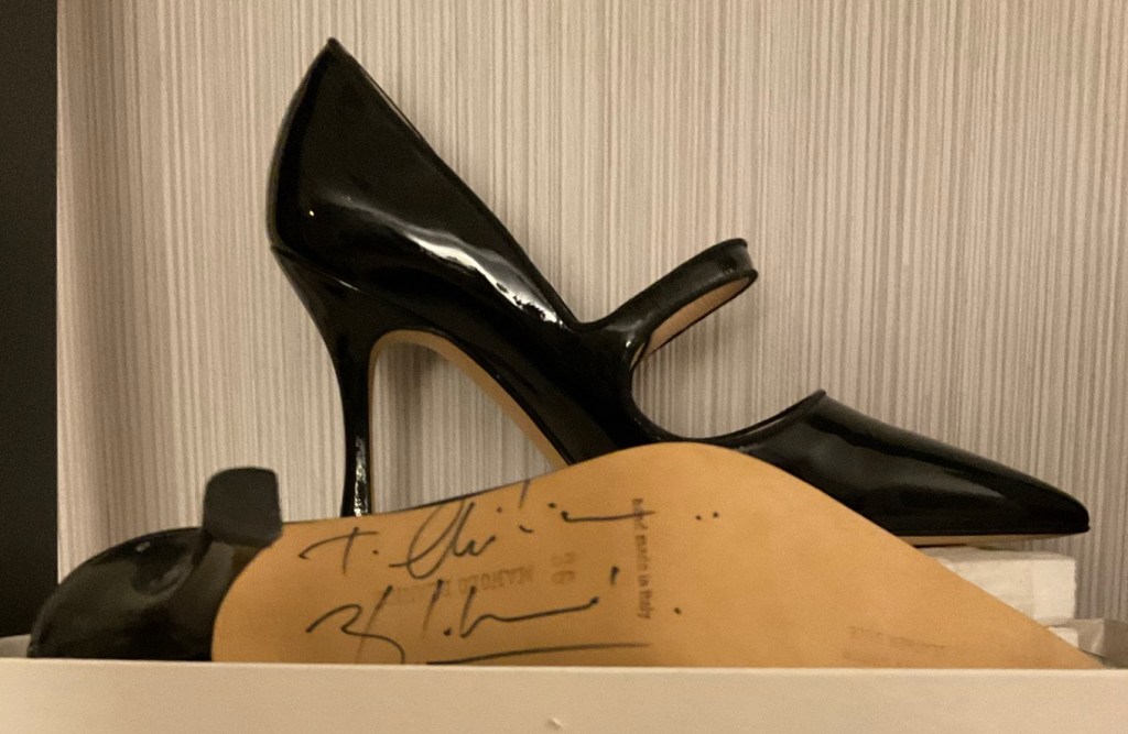 When I had the pleasure of meeting Mr. Blahnik at Saks Fifth Avenue during Boston Fashion Week he asked me what other colors he should make the shoes. I gave him a resounding, “All of them!” response. He laughed, then signed the bottom of my black patent leather Mary Janes. NO, I don’t wear them! They’re in a shoe shrine along with a self portrait from one of his books that he also signed for me.